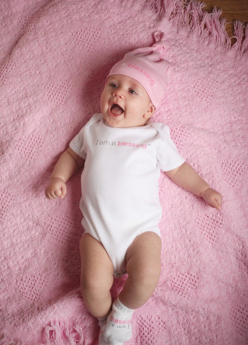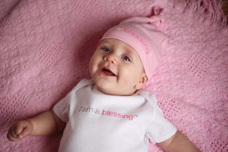 'I am a blessing'™ boxed set for baby girls. Three-piece set in white and pink with positive words of affirmation. Includes white one piece outfit with pink words (6-12 months), white infant socks with pink words (3-12 months), and pink hat with white and pink words (one-size). A perfect as a shower gift for baby girls and a new baby gift. Presented in a pretty box.