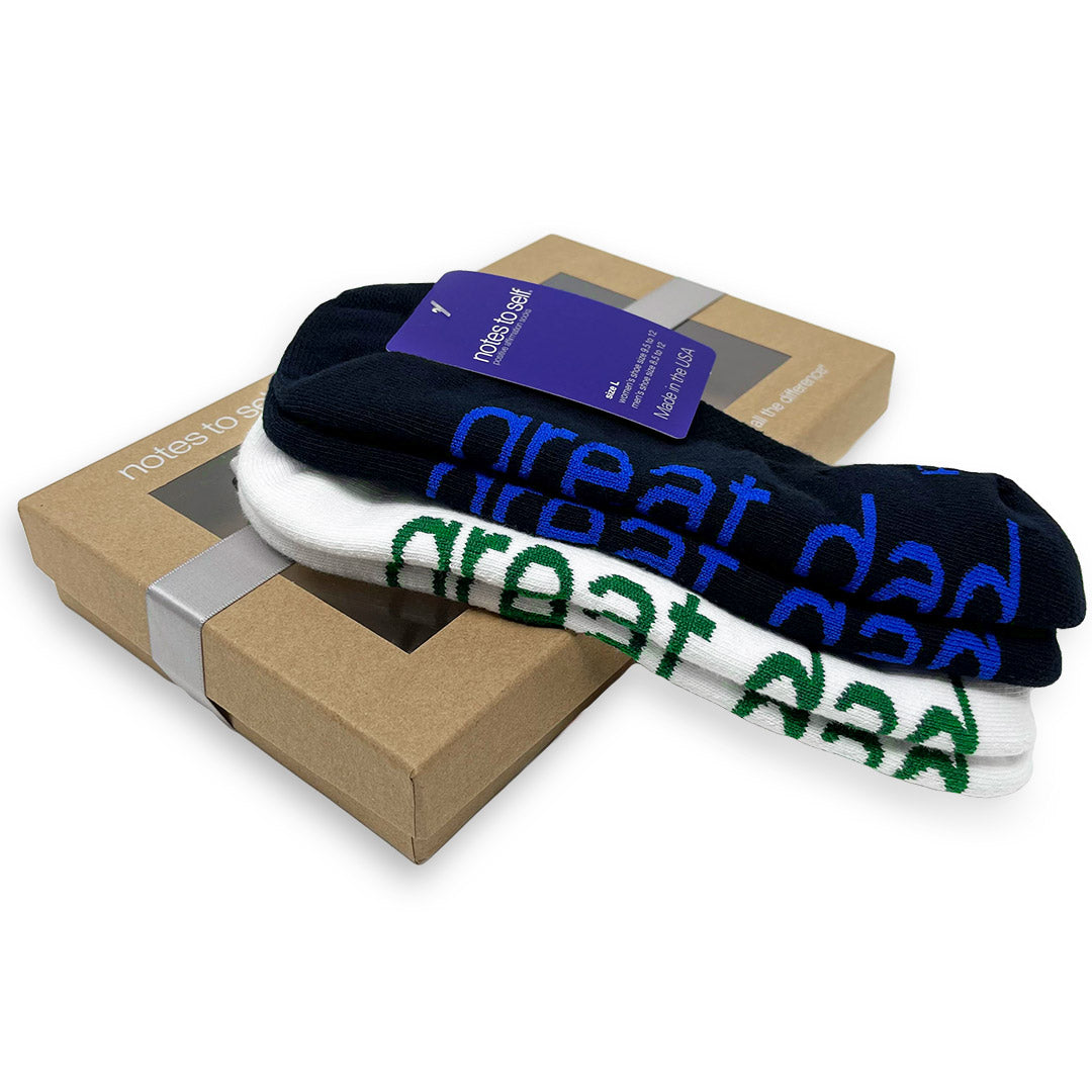 2 pair sock gift set: 1 pair of I am a great dad® white socks with hunter green words and 1 pair of I am a great dad® black socks with royal blue words. Presented in a kraft gift box tied with a satin ribbon. Box dimensions: 9 3/4" x 6 1/4" x 1 3/4".